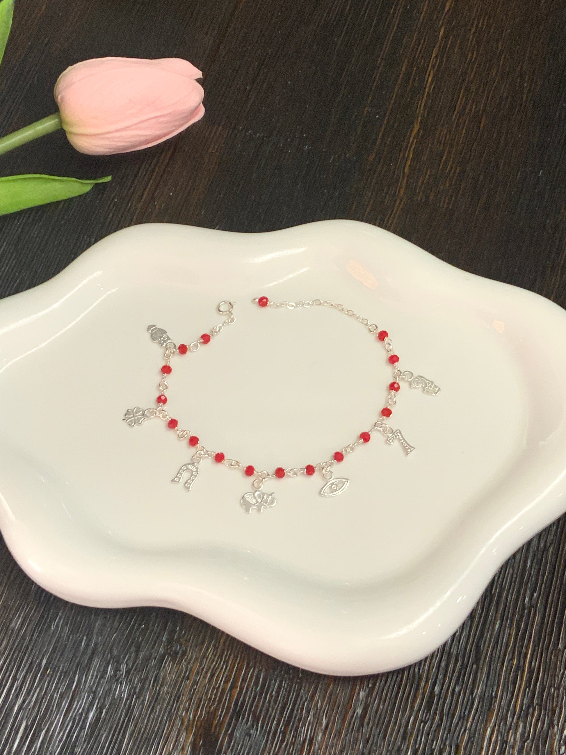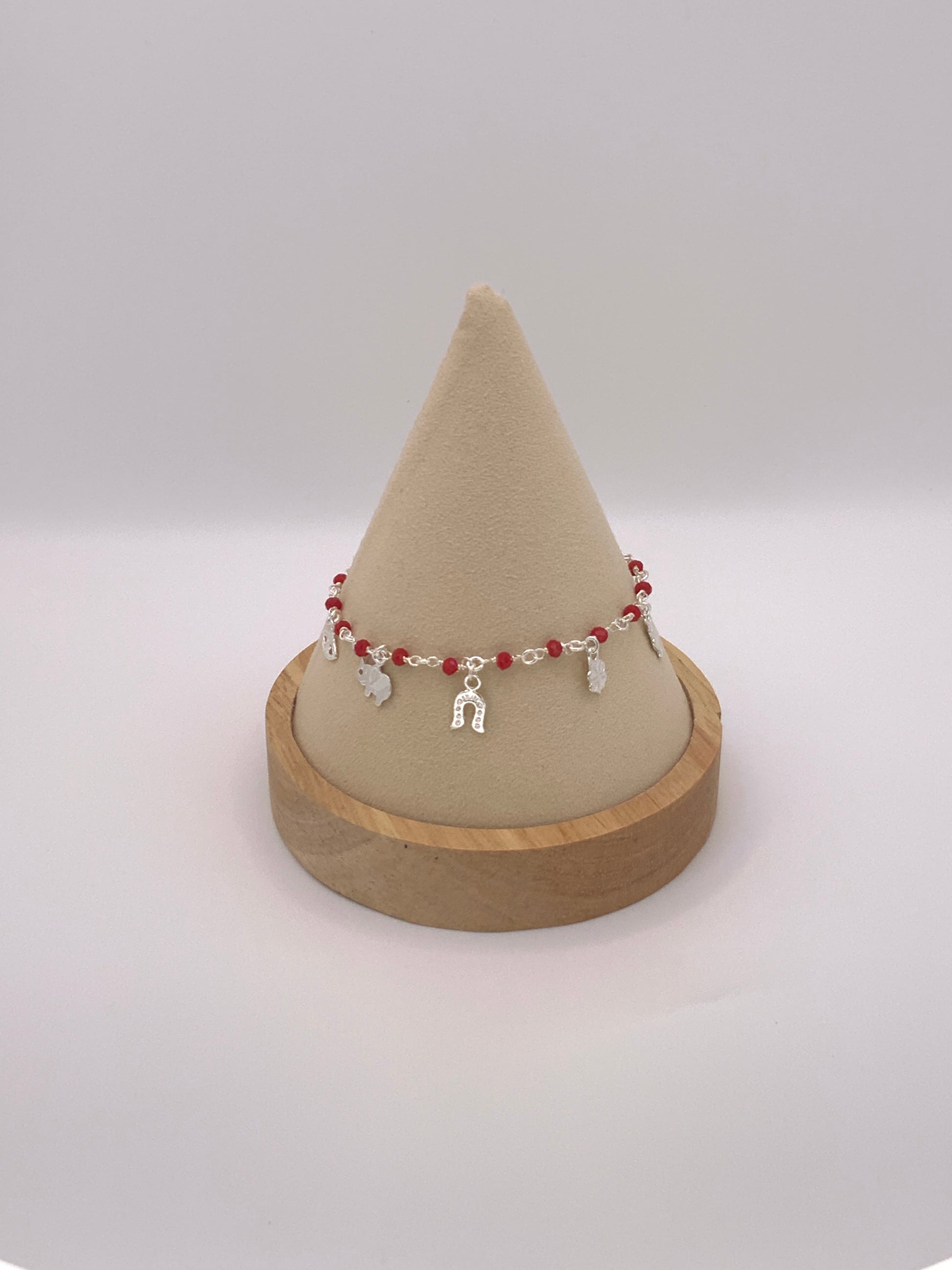 This Lucky Bracelet is made of high-quality Sterling Silver 925 and features a length of 7.5 inches. The bracelet also includes beautiful red crystals, adding a touch of color to the design. Wear it for good luck and elevate any outfit with its elegant and stylish appearance.