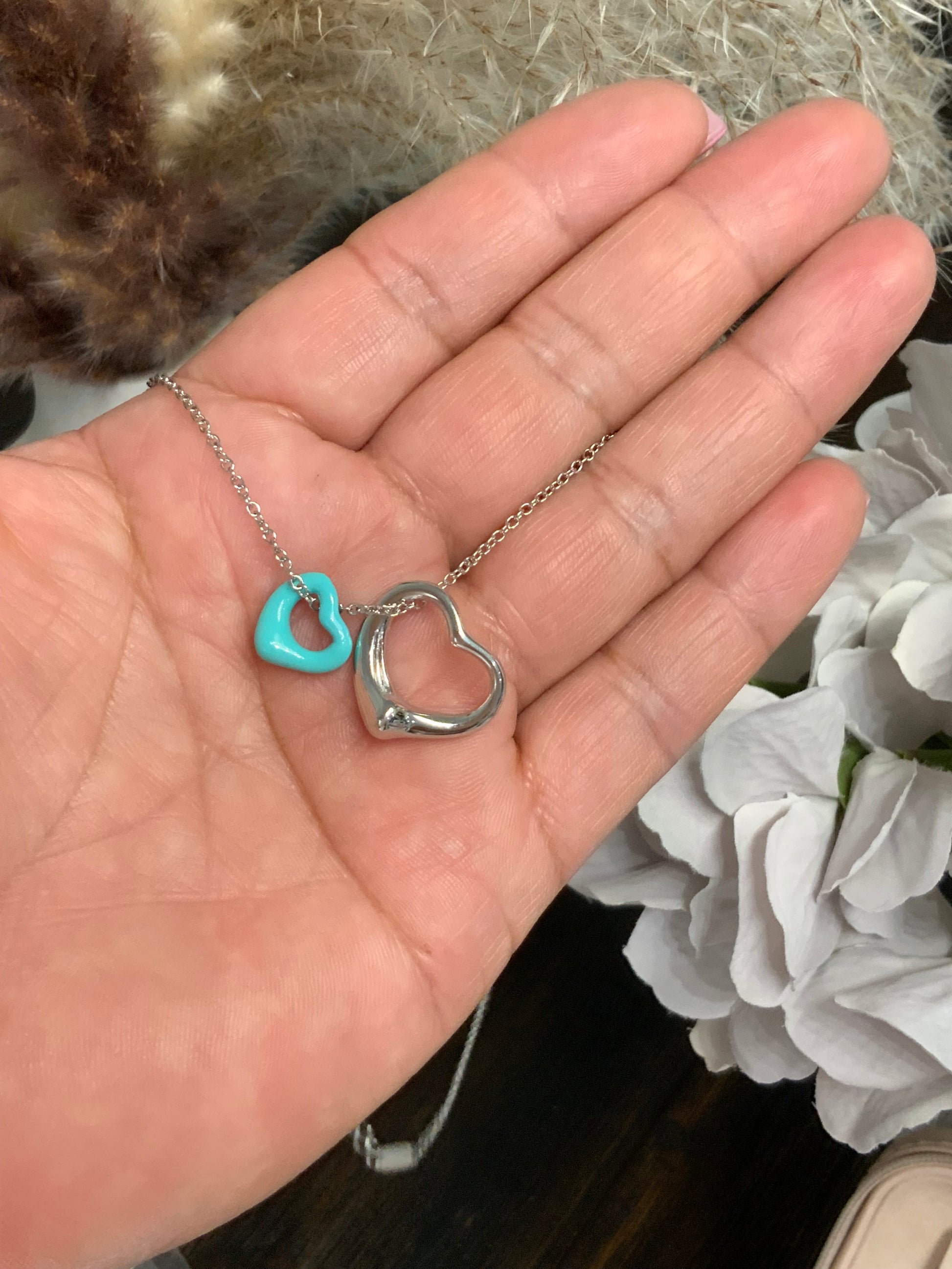 The Open Heart Turquoise Necklace, crafted from 925 sterling silver, measures 18 inches in length. It features a design with two hearts—one in sterling silver and the other in turquoise—providing a striking contrast that enhances aesthetic appeal. This combination offers a balanced blend of durability and beauty.