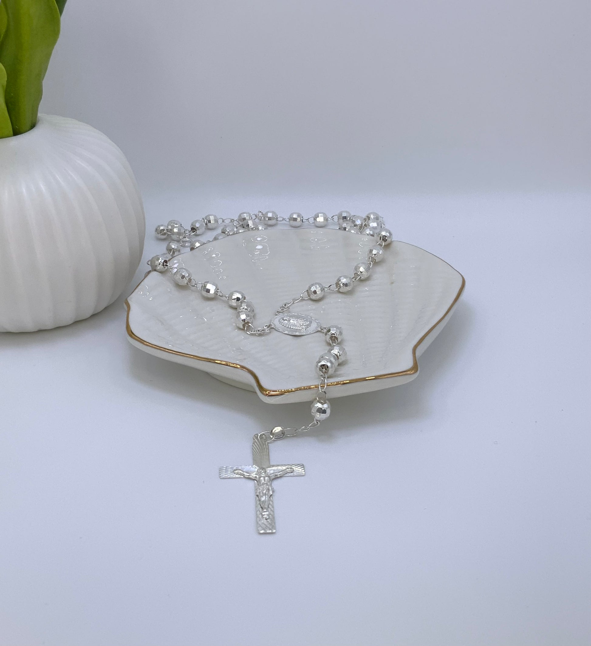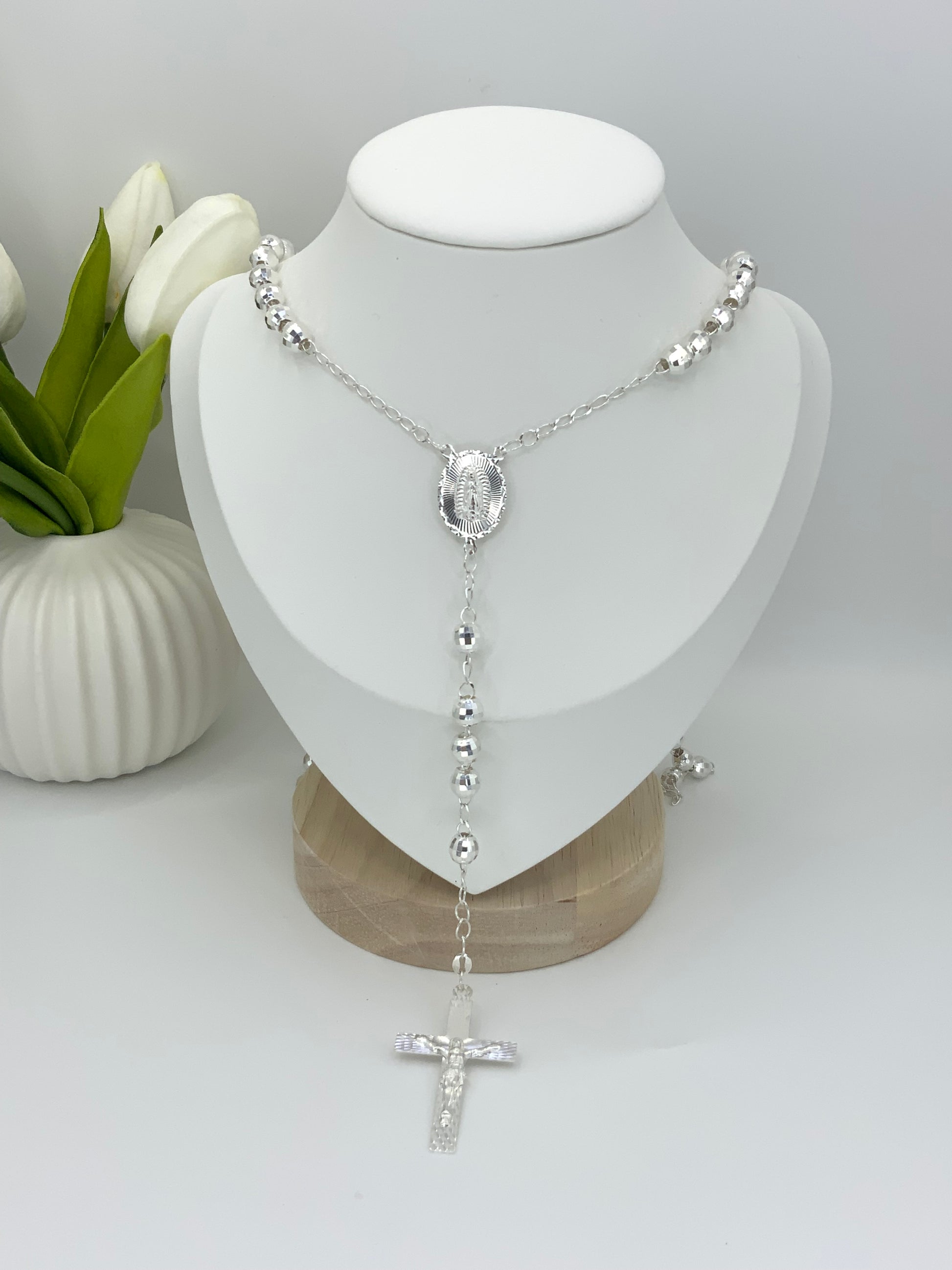 This stunning Rosary Necklace in Sterling Silver925 is the perfect accessory for any occasion. Measuring 25 inches in length, it features a beautiful Virgin Mary charm adorned with sparkling diamonds. Crafted with high-quality materials, this necklace is both elegant and durable. Elevate your style with this exquisite piece.