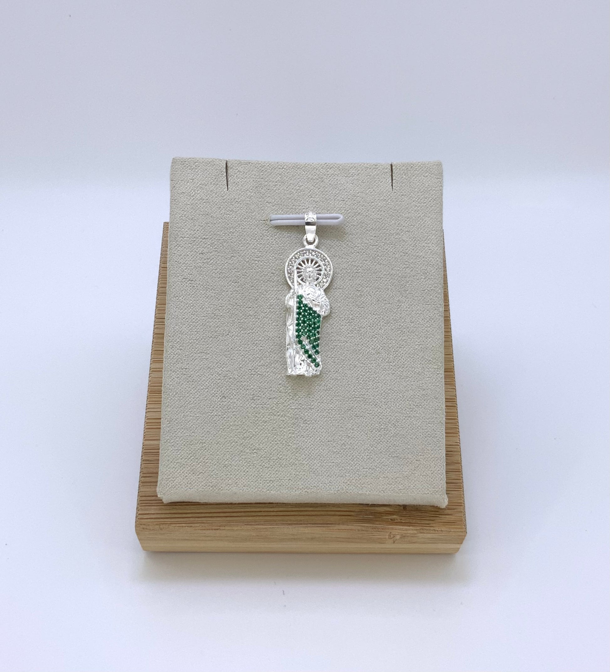 Expertly crafted in Sterling Silver 925, this Saint Jude pendant features exquisite green and white Zc stones. Measuring at 1.30 inches, it's the perfect size to wear on a chain or bracelet. Showcase your faith with this stunning and meaningful piece.
